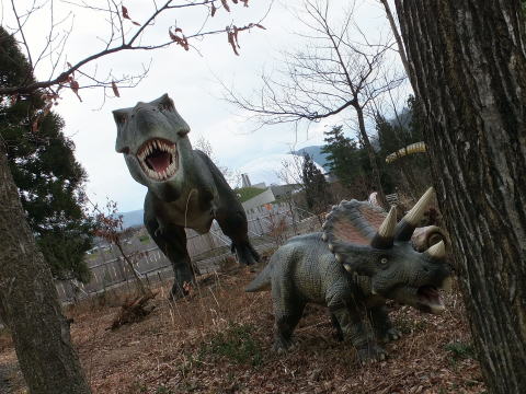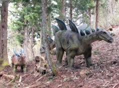 「公園内に 実物大の恐竜模型が展示されている」